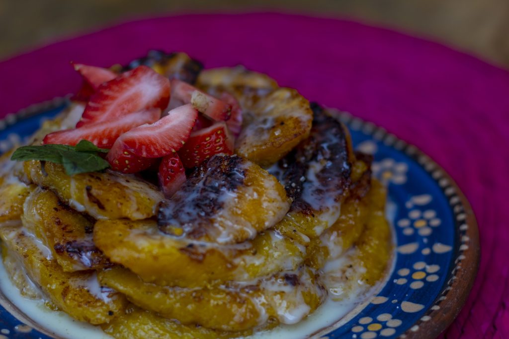 + Plátano macho a la plancha (Con lechera y trocitos de fresa). $95